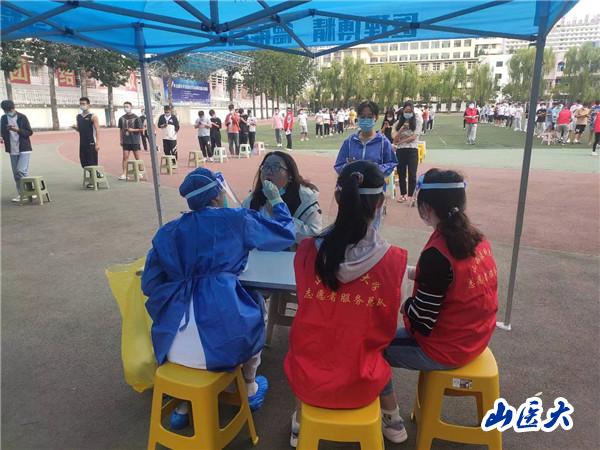 相比于白天的骄阳似火,晚上的山医校园气温骤降。药学院2021级志愿者张瀚文也感触颇深,“看着新同学们,踏着夕阳与繁星,急匆匆地赶来做核酸,感觉到新鲜的血液正源源不断地注入医科大。”