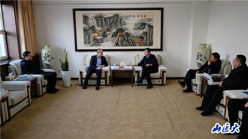 1月29日下午,校党委书记王军在迎泽校区会见了首都医科大学党委常委、副校长张晨,我校优秀校友、首都医科大学科技处副处长周建,并就申报国家自然科学基金区域创新发展联合基金进行了座谈交流。副校长张岩波,学校办公室、科学技术部、口腔医院等单位、部门负责人参加了会谈。