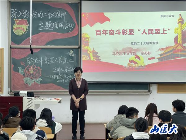 为扎实推动党的二十大精神进校园,引导青年学生自觉把思想和行动统一到党的二十大精神上来,3月17日,口腔医学院在中都校区至善C座104教室组织开展学习贯彻党的二十大精神主题团日活动。活动特邀校级思政课骨干教师宣讲团成员、马克思主义学院宗苏秋老师,以“百年奋斗彰显人民至上”为题进行宣讲。口腔医学院100余名本科生参加活动。