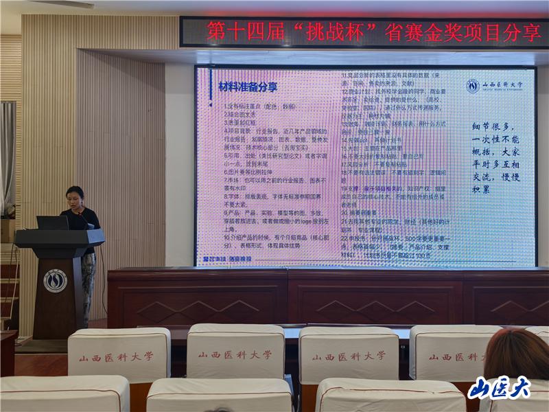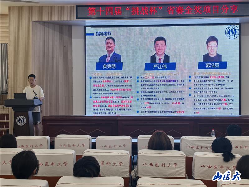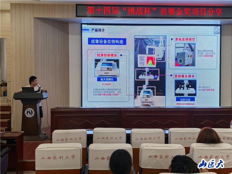本次活动邀请了我校在第十四届“挑战杯”山西省大学生创业计划竞赛获得金奖的团队代表,他们依次上台分享了各自的参赛项目及备赛经验,四件作品分别是《大国重器——中国“智”造法医身份鉴识系统》《ICH脑视清——可视精准穿刺,脑部安全引流》《福锐森——开启恶性肿瘤骨转移精准诊疗新时代》《毒易检——开创毒品快速精准检测新时代》。