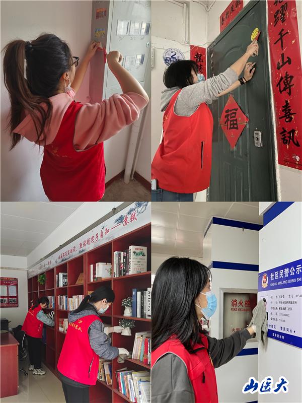 此外,志愿者们前往学校北家属院、南家属院、新建南路二社区、第一医院宿舍、网通宿舍等地,对居民进行创城文明城市的宣传、并为其提供了日常帮助,整理并清扫小区楼道内杂物和小广告,帮助社区清扫了办公室内书架、展板和会议室,收集和整理了闲置物等。
