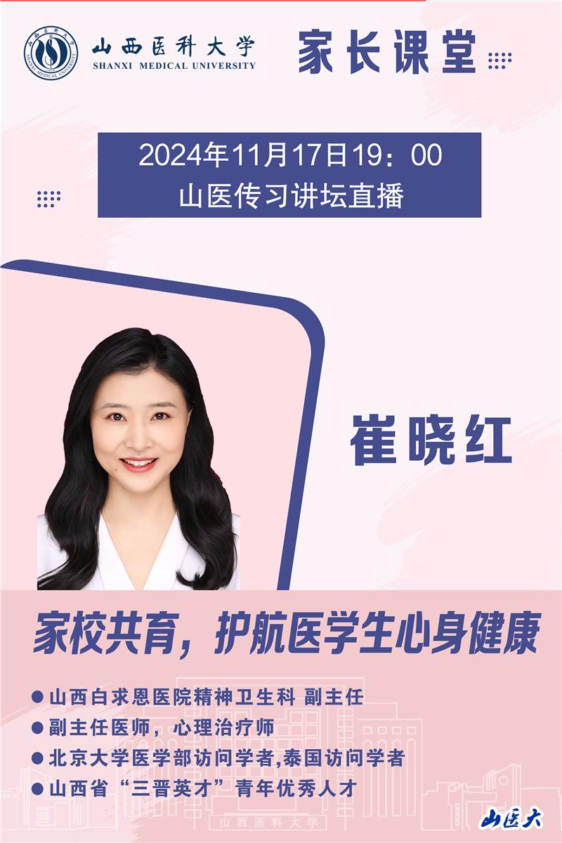 11月17日晚,学校心理健康教育中心线上召开“家校共育,护航医学生身心健康”主题活动,邀请到山西白求恩医院精神卫生科副主任、副主任医师、心理治疗师,北京大学医学部访问学者、泰国访问学者,山西省“三晋英才”青年优秀人才崔晓红主讲。此次活动共有4465名家长热情参与。