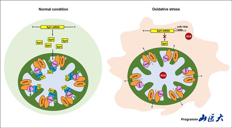 生理条件下,miR-193b低表达,大量的Syt1富集于线粒体与Parkin蛋白结合并促进Parkin泛素化修饰CypD,防止mPTP过度开放,线粒体和细胞维持正常结构功能。氧化应激条件下,miR-193b大量表达,抑制了Syt1功能,CypD的泛素化修饰被减弱,进而介导mPTP过度开放,引起线粒体结构功能紊乱,细胞发生程序性坏死,进而导致心肌I/R损伤。