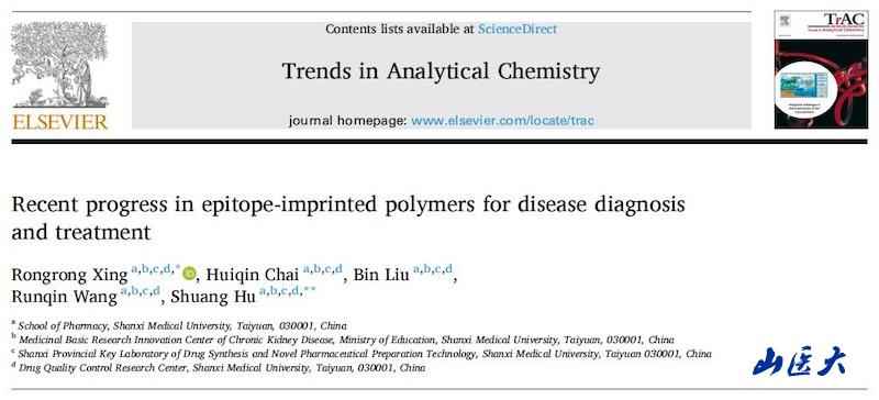 8月24日,我校药学院胡爽教授团队在国际分析化学期刊 Trends in Analytical Chemistry(中国科学院一区TOP期刊,IF=12)发表综述论文“Recent progress in epitope-imprinted polymers for disease diagnosis and treatment”,药学院药物分析教研室青年教师邢荣荣为第一作者,邢荣荣副教授和胡爽教授为共同通讯作者。