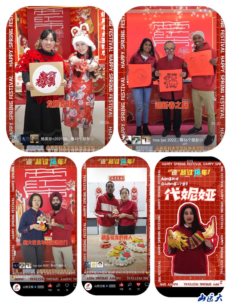 春节期间,在省委宣传部和省教育厅国际处的指导下,我校国际教育学院与山西卫视融媒体携手,拍摄“全世界爱过中国年”系列视频,在山西卫视正月初一至初六期间连续播出,我校五位留学生在非遗传承人的悉心教授下,学习了剪窗花、捏面塑、绛州木版年画、做花馍、做糖画,在山西多样的非遗年俗里过龙年。