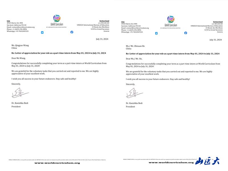 近日,我校公共卫生学院王庆尧和贺芷璇两位同学圆满完成世界比较教育学会(World Curriculum By Comparative Education Societies)为期3个月的线上实习项目并获得实习证书。